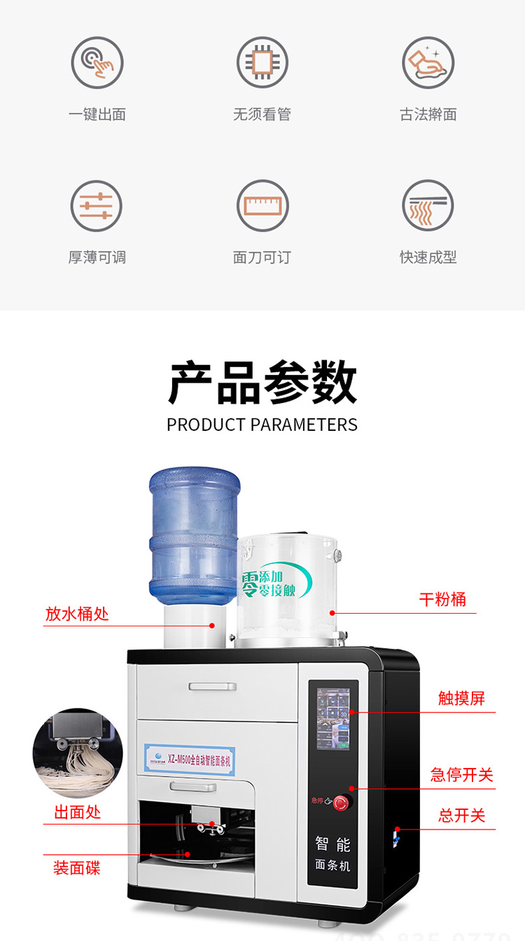 全自动商用快速出面电动素面湿面M500台式制面机器,20秒全自动出面,全程无需看管。一键出面,面做好,自动停。均匀滴漏加水系统,水面比例把握更好。自动滴漏加水系统,运作过程加水更均匀,适量控水,面条更有嚼劲。